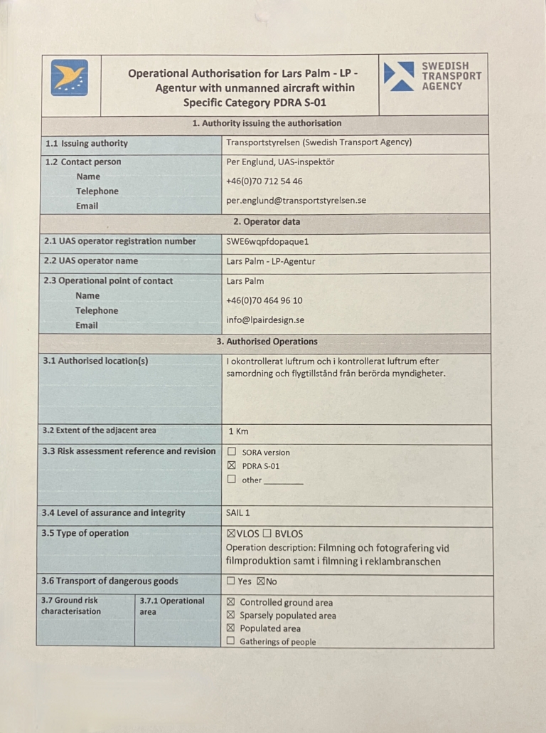 Våra tyngre farkoster Raw V 3.0 som är utrustade med Alexa mini eller RED kameror och som har en totalvikt under 25 kg kommer vi att kunna flyga när exempelvis Bromma kontrollzon är stängt för all övrig flygtrafik. de här farkosterna kan vi bara flyga i exempelvis Bromma kontroll zone när den är stängd och måste flygas på ett säkert avstånd sidled från bostads-, affärs, industri eller rekreationsområden.